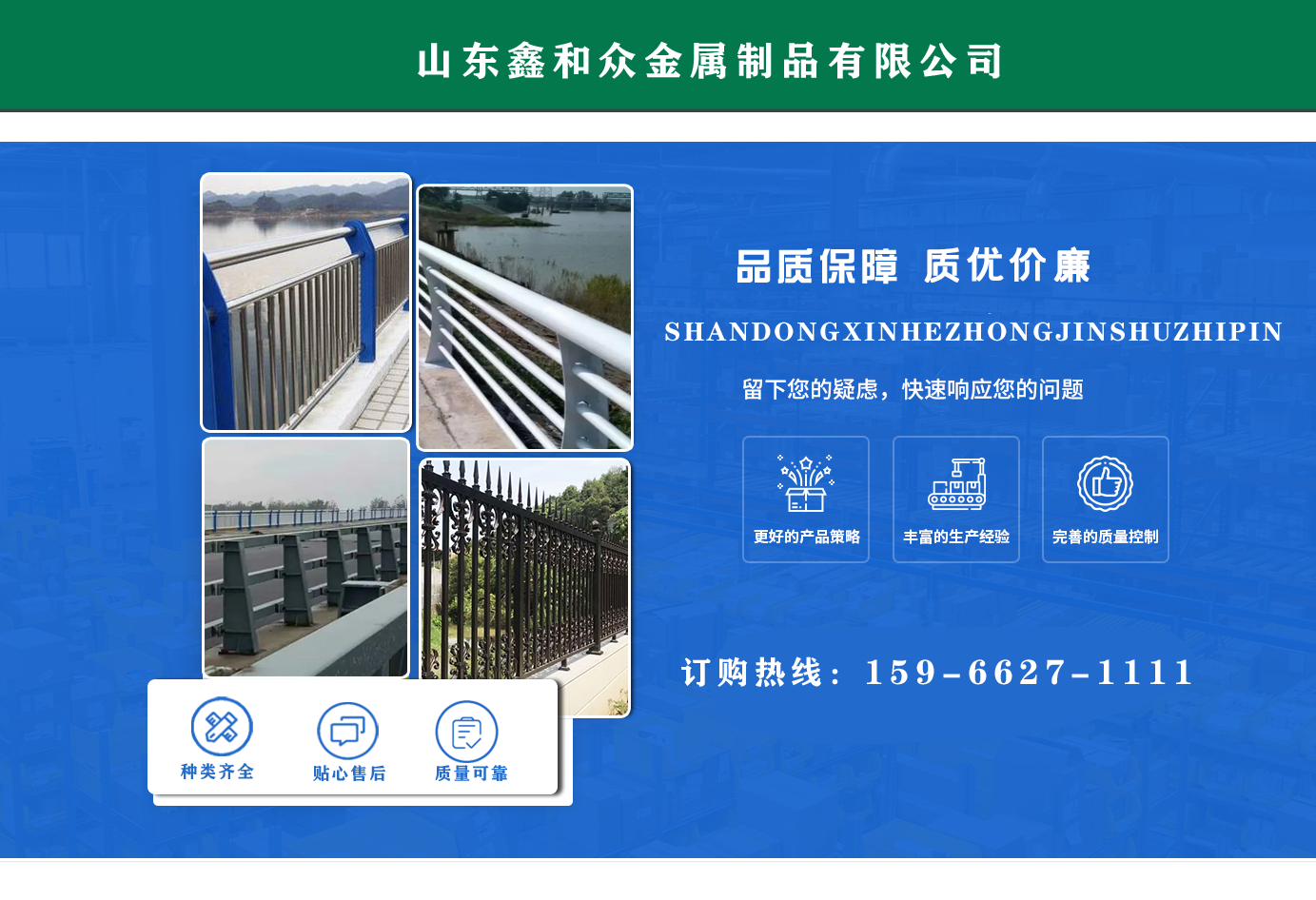 山東鑫和眾金屬制品有限公司主要產(chǎn)品有防撞護(hù)欄,橋梁護(hù)欄,道路護(hù)欄,河道護(hù)欄,不銹鋼護(hù)欄等護(hù)欄。提供設(shè)計(jì)方案,一站式定制,包您滿意價(jià)格優(yōu)惠,歡迎來電咨詢! 公司常年從事銷售護(hù)欄防撞護(hù)欄,橋梁護(hù)欄,道路護(hù)欄,河道護(hù)欄,不銹鋼護(hù)欄,橋梁鋼護(hù)欄,河道燈光護(hù)欄等。產(chǎn)品廣泛應(yīng)用于橋梁、河道、旅游景區(qū)、道路、公路、公園、小區(qū)、景觀、道路防撞等領(lǐng)域。 公司產(chǎn)品均采用優(yōu)質(zhì)不銹鋼材料,符合相關(guān)標(biāo)準(zhǔn)。各種型號不銹鋼復(fù)合管及護(hù)欄,質(zhì)量嚴(yán)格把控。產(chǎn)品強(qiáng)度高、耐腐蝕、焊接牢固、抗沖擊、性能好,防撞護(hù)欄結(jié)構(gòu)簡單、美觀實(shí)用大方。 歡迎前來訂購!...